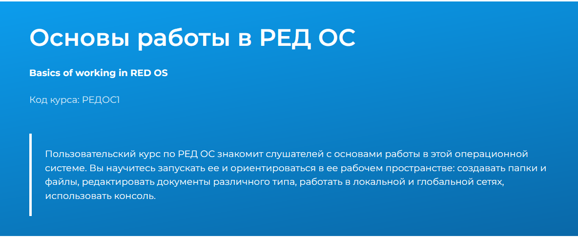 Пользовательский курс по РЕД ОС знакомит слушателей с основами работы в этой операционной системе. Вы научитесь запускать ее и ориентироваться в ее рабочем пространстве: создавать папки и файлы, редактировать документы различного типа, работать в локальной и глобальной сетях, использовать консоль.